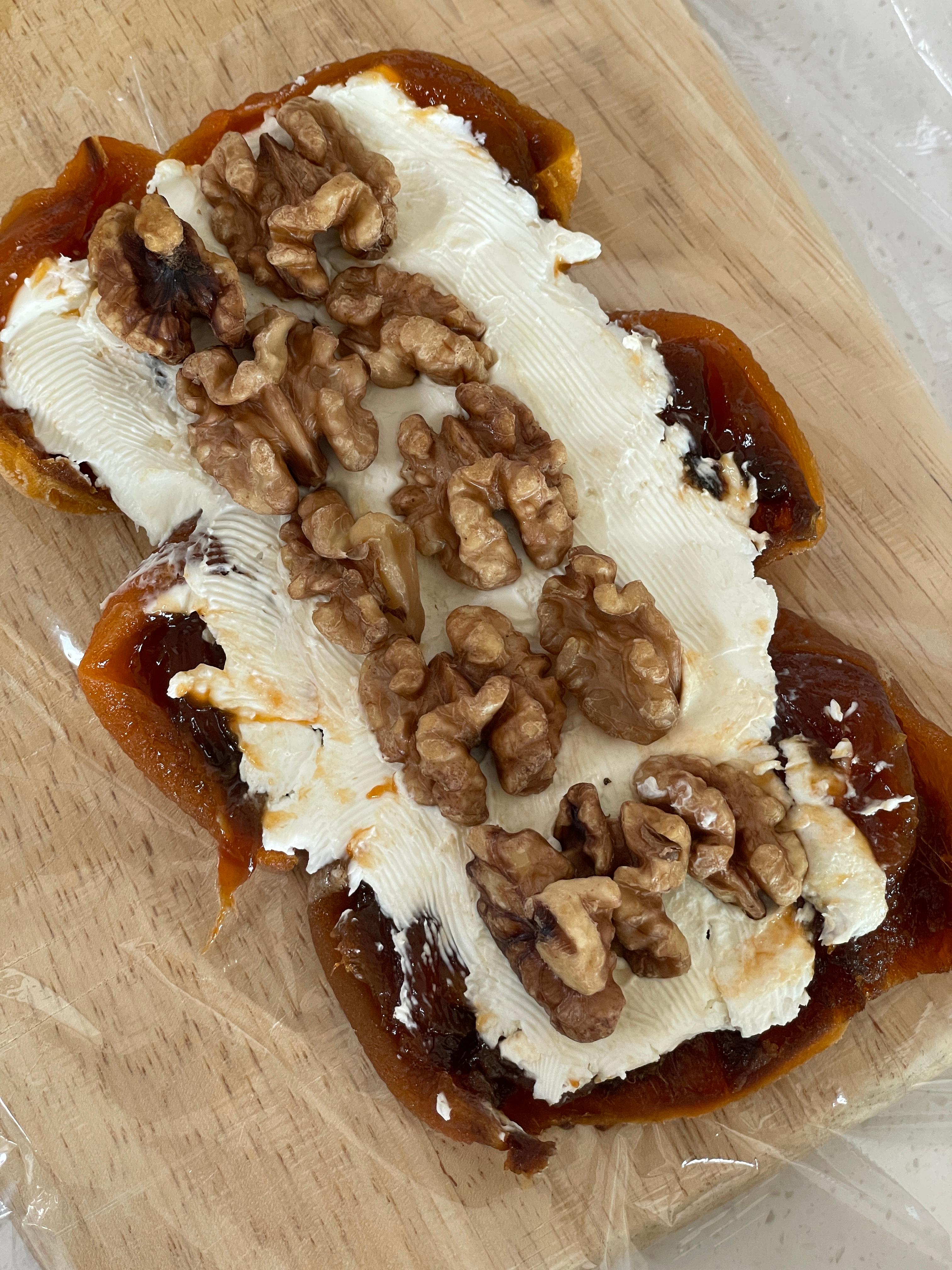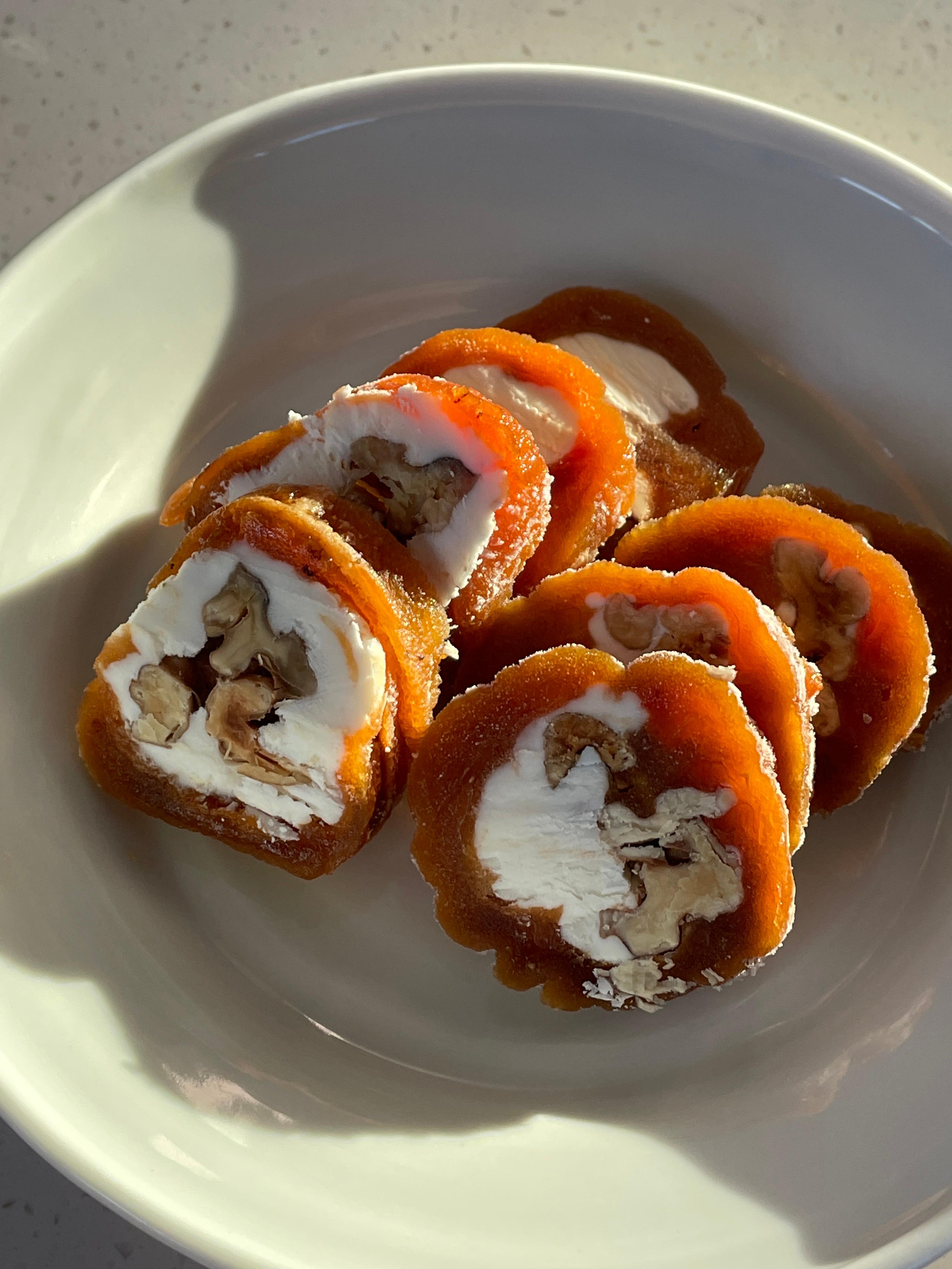 2. 속재료 넣기: 곶감 중앙에 크림치즈를 줄 긋듯 바르고, 그 위에 호두를 줄 세워 올린다.