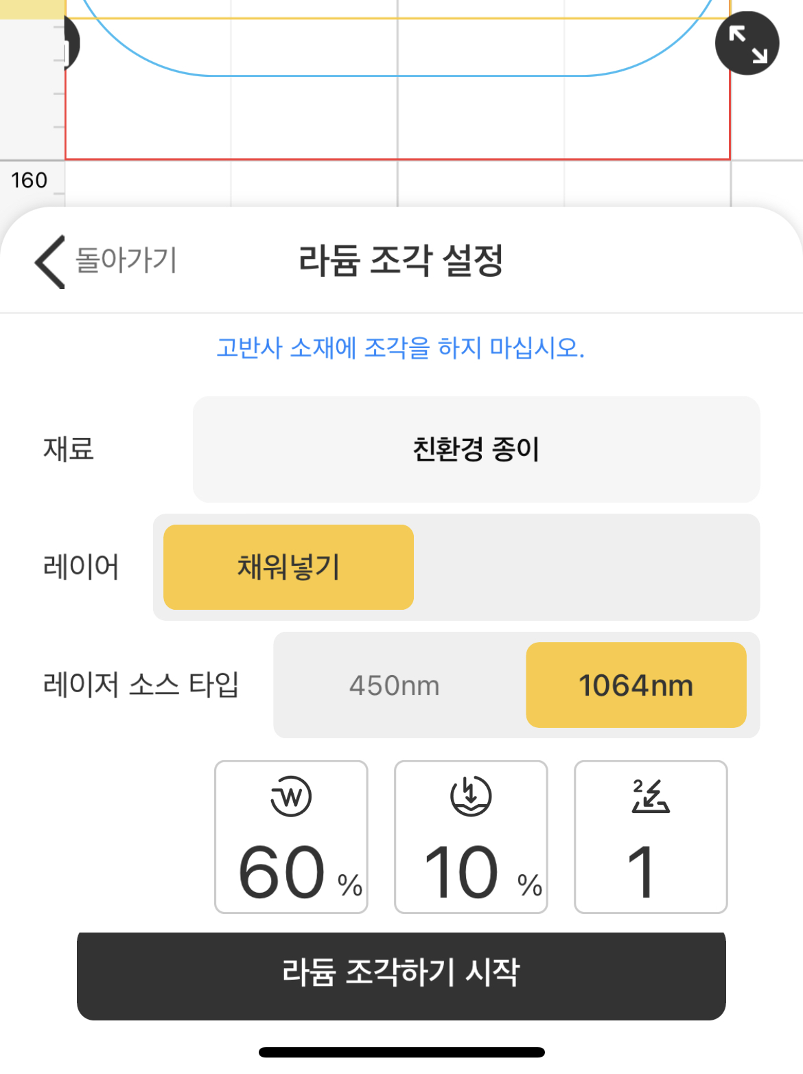하지만 어플에서 모두 조절 가능한 부분이기 때문에 (레이저 초점을 맞추기 위한 상하이동은 각인기 측면의 버튼으로 가능) 버튼 제외하고는 건드릴 일이 없다.